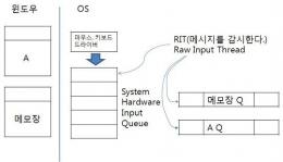- RIT는 쓰레드 ID만 보고 ID에 해당하는 메시지 Q에 전달하면 GetMessage 로 메시지를 꺼내 DispatchMessage 를 사용해서 해당 WndProc에 메시지를 보낸다. 현재 포커스에 입력되게 된다.